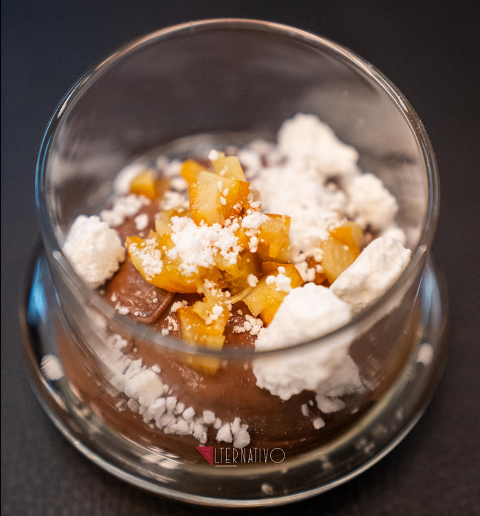 7,00 €Pera cotta con namelaka al cioccolato fondente e gel al rhum